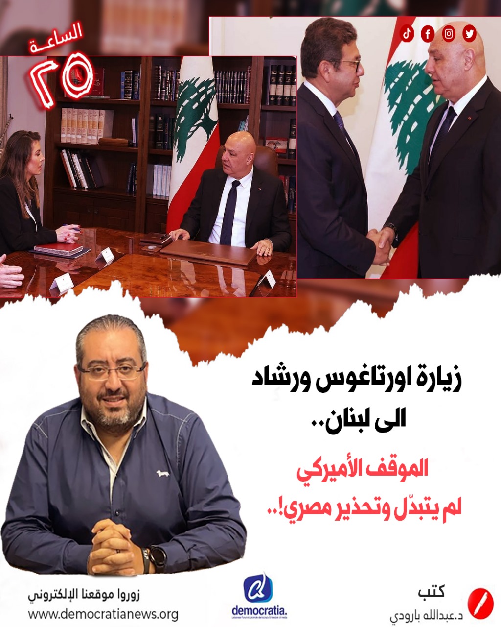 زيارة اورتاغوس ورشاد الى لبنان..الموقف الأميركي لم يتبدّل وتحذيرمصريّ!.. للمزيد » Democratia News 29/10/2025 12:56 م