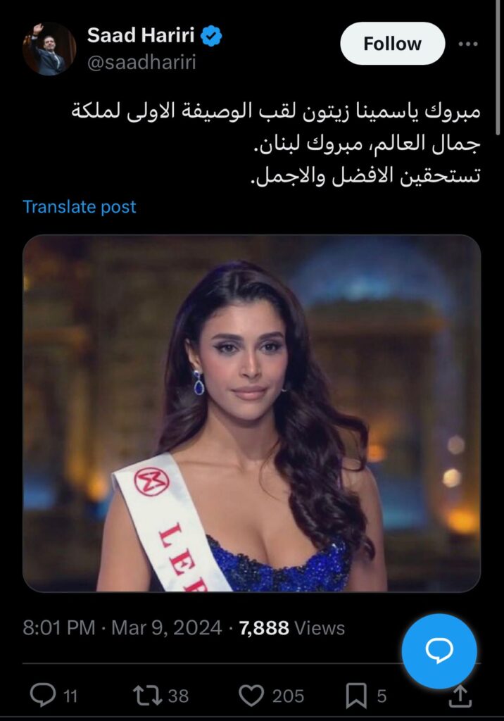 الحريري: مبروك ياسمينا زيتون مبروك لبنان