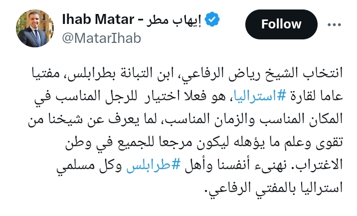 انتخاب الشيخ رياض الرفاعي، ابن التبانة بطرابلس، مفتيا عاما لقارة استراليا، هو فعلا اختيار للرجل المناسب في المكان المناسب والزمان المناسب، لما يعرف عن شيخنا من تقوى وعلم ما يؤهله ليكون مرجعا للجميع في وطن الاغتراب. نهنىء أنفسنا وأهل طرابلس وكل مسلمي استراليا بالمفتي الرفاعي.