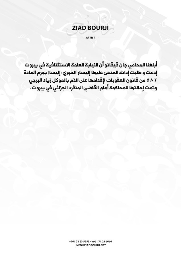 وأرفق منشوره ببيانٍ جاء فيه “أبلغنا المحامي جان قيقانو أن النيابة العامة الإستئنافيّة في بيروت إدّعت وطلبت إدانة المُدعّى عليها اليسار خوري (اليسا) بجرم المادة 582 من قانون العقوبات لإقدامها على الذم بالموكل زياد برجي، وتمّت احالتها للمحاكمة أمام القاضي المنفرد الجزائي في بيروت”.