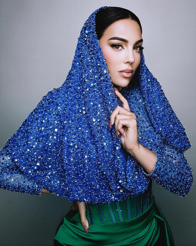 التصميم الفريد والراقي حاز على إعجاب المتابعين وروّاد مواقع التواصل الإجتماعي، الذين أشادوا بإطلالة “جورجينا” وبجمال التصميم الذي تميّز باللون النيللي والقماش البرّاق المطرّز وجاء متكاملاً مع الفستان باللون الأخضر.