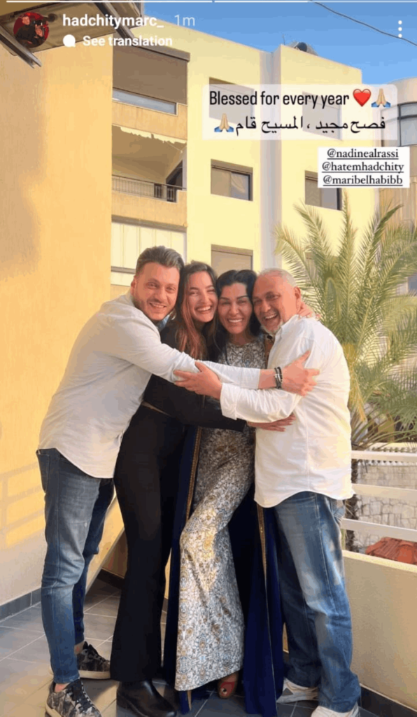 كما نشرت نادين صورة مع طليقها حاتم وابنهما مارك وحبيبته ماريبيل حبيب، متمنية فصحا مجيدا للمتابعين.