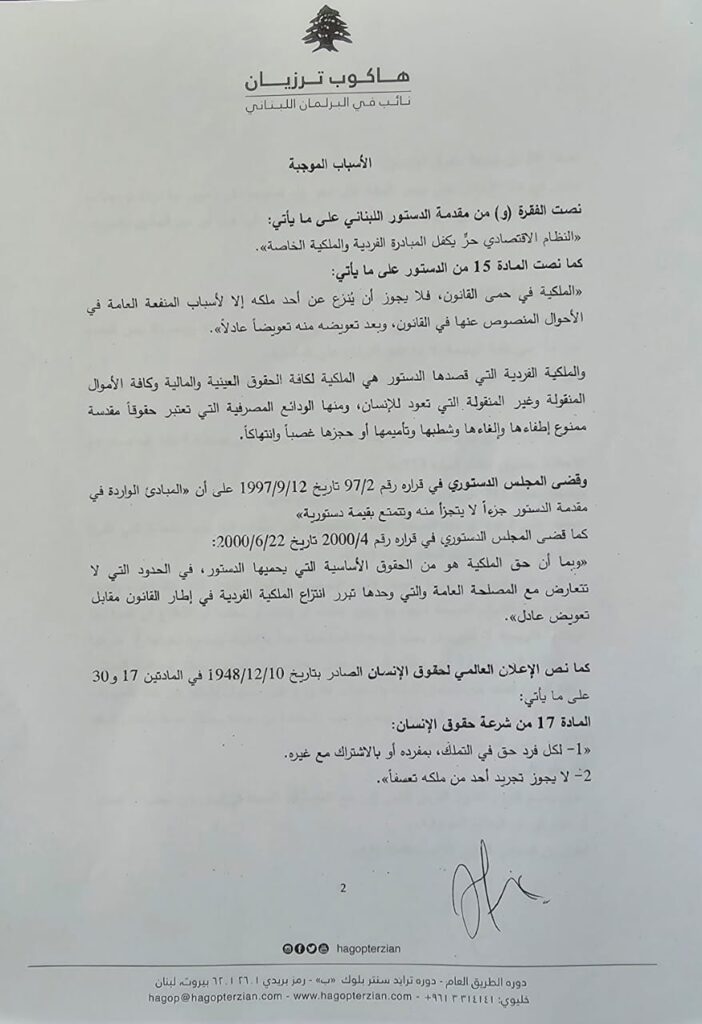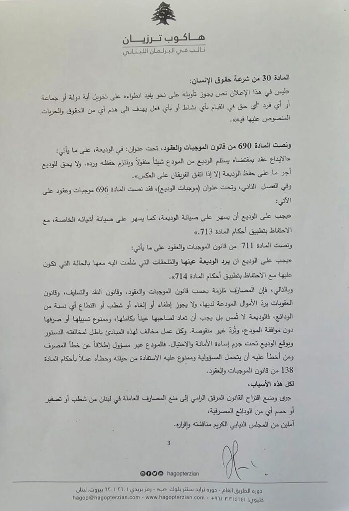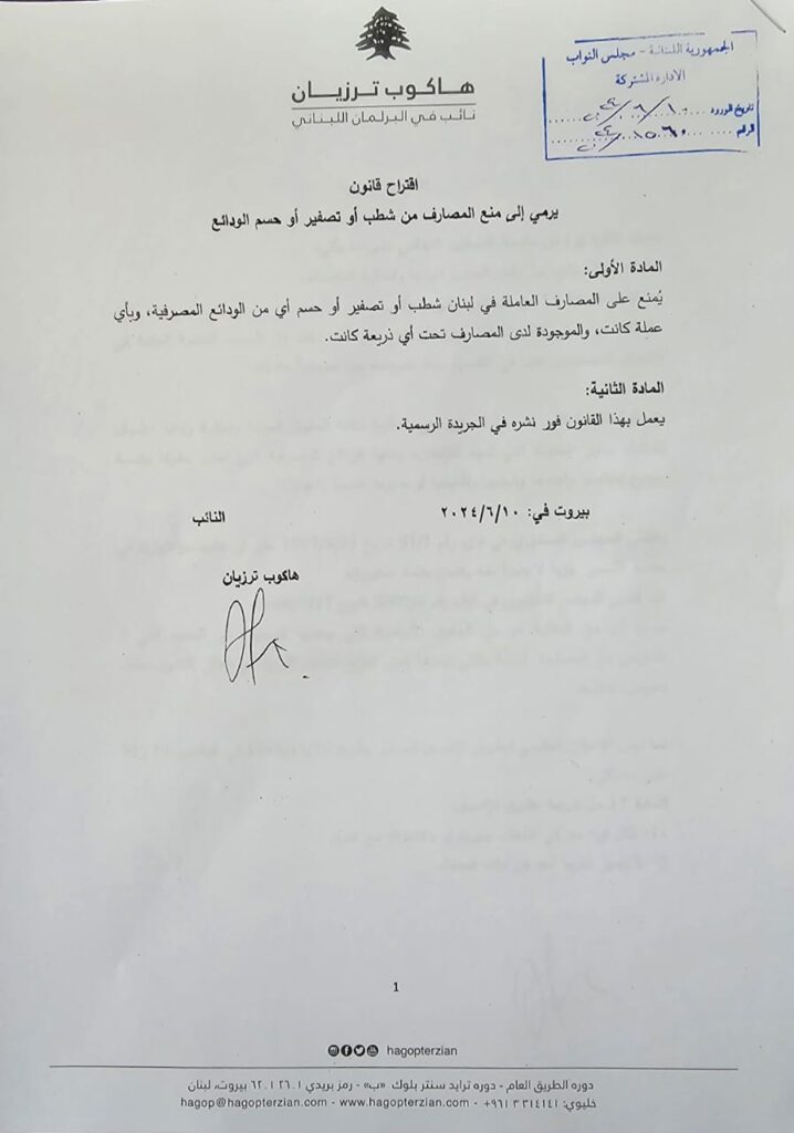 أعلن النائب هاكوب ترزيان، في بيان، انه تقدم اليوم “بإسم كتلة نواب الأرمن، الى أمانة سر المجلس النيابي اقتراح القانون الرامي الى منع شطب أو حسم أو تصفير حقوق المودعين في المصارف اللبنانية، وهذا القانون يرمي الى الغاء كل الجدل حول حماية أموال المودعين”.
