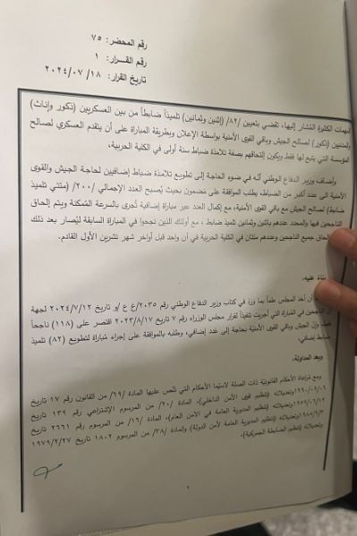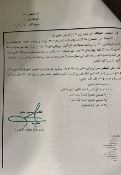 وبعد المداولة، ومع مراعاة الأحكام القانونية ذات الصلة، لا سيما الأحكام التي تنص عليها المادة 69 من القانون 17 (تنظيم قوى الأمن، وتعديلاته للأمن العام، وأمن الدولة وتنظيم الضابطة الجمركية ) قرر المجلس الموافقة على طلب وزير الدفاع الوطني الرامي الى الموافقة على مضمون هذا الكتاب، اي كتاب قيادة الجيش رقم19326 تاريخ11/7/2024 بحيث يصبح العدد الاجمالي200 تلميذ ضابط لصالح الجيش مع باقي القوى الأمنية، مع إكمال العدد عبر مباراة إضافية تجرى بالسرعة الممكنة ويتم إلحاق الناجحين فيها والمحدد عددهم ب82 تلميذ ضابط مع أولئك الذين نجحوا في المباراة السابقة ليصار بعد ذلك الى إلحاق جميع الناجحين وعددهم200 في الكلية الحربية في آن واحد، قبل أواخر شهر تشرين الأول المقبل.