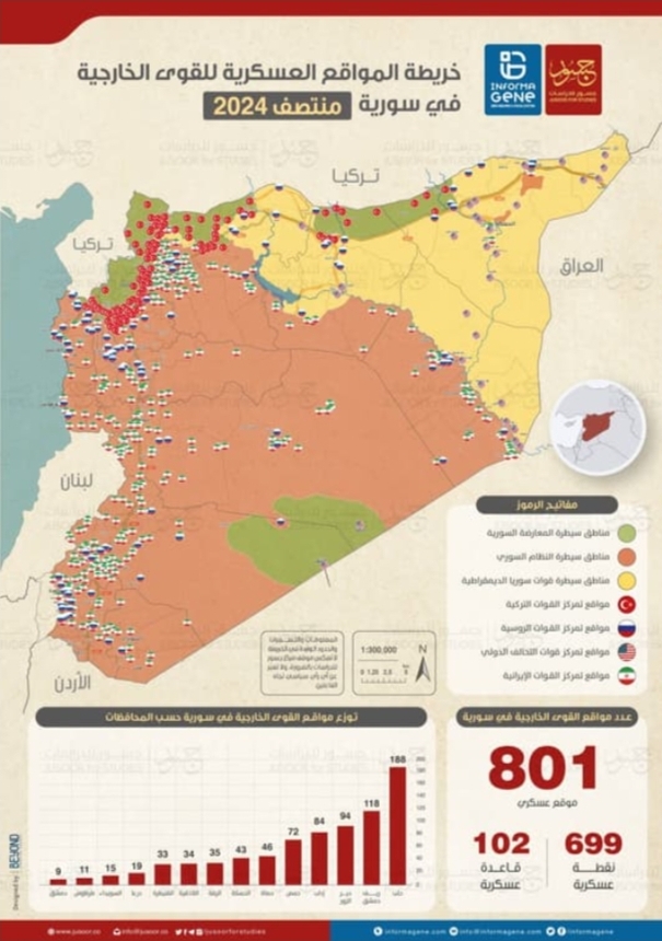 شهد التحديث السنوي لخريطة انتشار الوجود العسكري الأجنبي في سوريا، «انخفاضاً محدوداً» خلال الفترة بين منتصف عامَي 2023 و2024؛ بتراجع عدد القواعد والنقاط العسكرية الأجنبية من 830 إلى 801 موقع، حسب «مركز جسور للدراسات».وبينما ينوّه التقرير إلى مساهمة الوجود العسكري الأجنبي في سوريا واتفاق وَقْف إطلاق النار بين تركيا وروسيا في 5 آذار 2020، بفرض أطول فترة تهدئة وتجميد لحدود السيطرة وخطوط التماسّ بين القوى المحلية، يلفت إلى أن هذه العوامل أدت في الوقت ذاته إلى «وصول النزاع في سوريا إلى طريق مسدود»، فقد حالت دون قدرة أي طرف على الحسم الميداني رغم استمرار النشاط العسكري «الذي يعكس إصراراً على عدم التخلّي عن الحل العسكري»، وما قد ينجم عن ذلك من زيادة احتمال وقوع صدام مباشر بين القوات الأجنبية في سوريا.يلفت التقرير أيضاً إلى تراجع المواقع العسكرية الإيرانية في سوريا من 570 إلى 529، مما يفسر أن «إيران لا تزال الدولة صاحبة الانتشار العسكري الأكبر، مقارنةً مع بقية القُوَى الأجنبية».يتقاطع تقرير أخير للمرصد السوري لحقوق الإنسان، مع نتائج خريطة مركز «جسور»، إذ يفيد بأن إيران تتغلغل في عمق البلاد وتواصل عبر ميليشياتها الهيمنة المطلقة على معظم المناطق التي تشهد تحركات يومية للإيرانيين والميليشيات التابعة، عبر سعي متواصل لترسيخ وجودها بأساليب عدة، وخطة ممنهجة لتغيير ديمغرافية المناطق.ولدى إيران 52 قاعدة عسكرية، إلى جانب 477 نقطة، متوزعة على 117 موقعاً في حلب، و109 بريف دمشق، و77 في دير الزور، و67 في حمص، و28 في حماة، و27 في إدلب، و20 في القنيطرة، و17 في اللاذقية، و16 في درعا، و14 في الرقة، و13 في السويداء، و9 في طرطوس، و8 في الحسكة، و7 في دمشق.اقتصر تحديث الخريطة على المواقع العسكريّة الثابتة والمستقرّة؛ ولم تشمل النقاط والحواجز ونقاط التفتيش المتحرّكة والمؤقتة التي يستخدمها بعض القوات خلال عملها العسكري، خصوصاً الميليشيات الإيرانيّة التي تعتمد على هذا الشكل من المواقع بشكل واسع.ويميز الباحثون القائمون على تحديث الخريطة الحالية، بين صنفين من المواقع العسكرية هما: القواعد والنقاط.القاعدة العسكرية تكون مجهَّزة بمُعَدّات وتجهيزات عسكرية وعملياتية، سواءً لمهامّ الدفاع أم الهجوم، كمهابط الطيران والأنظمة الصاروخية الأرضية والجوية، مع وجود وحدات على الأرض.من الملحوظات اللافتة أيضاً أن الخريطة «ترصد فقط النقاط التي تمتلك فيها القُوَى الأجنبية كامل الصلاحية والقيادة والتمويل»، وبذلك فإنّها لا ترصد انتشار الخبراء أو الفنيين أو العسكريين، قادة أو مستشارين أو عناصر ضِمن مواقع أو منشآت أو حواجز القوات المحلية المختلفة أو ضِمن مؤسسات الحكم والإدارة المدنية.في رد على سؤال عن تأثير القصف الأميركي (شرق سوريا) والإسرائيلي في الداخل السوري في قيادات ومواقع «الحرس الثوري»، أو حرب غزة، وفي تراجع الوجود العسكري الإيراني على محدوديته؟ يقول عبد الوهاب عاصي، باحث رئيسي في مركز «جسور للدراسات»، إن «تراجع المواقع الإيرانية جزء من عملية إعادة انتشار قامت بها ميليشياتها تحت ضغط روسي، حيث تركّز الانسحاب في المنطقة الجنوبية، أي إنه مرتبط بتداعيات الحرب على غزة».ويتوقع الباحث في حال استمرار التصعيد الإسرائيلي ضد الميليشيات الإيرانية في سوريا «حصول مزيد من الانسحاب، أو إعادة الانتشار للمواقع الإيرانية من الجنوب السوري»، لا سيما أنّ الضربات الإسرائيلية «زادت وتيرتها بشكل كبير بعد حرب غزة مقارنةً مع السنوات السابقة».غير أن انسحاب الميليشيات الإيرانية وعمليات إعادة التموضع المذكورة، حسب التقرير الجديد لـ«جسور»، لم يؤثرا في الأهداف والقيمة الاستراتيجية للانتشار العسكري في سوريا، الذي لا يزال يحافظ على الطريق الدولي الذي يقطع سوريا عرضاً، من معبر البوكمال في محافظة دير الزور مروراً بالبادية السورية ومنها إلى محافظات حمص ودمشق، وصولاً إلى الحدود اللبنانية.هذا إضافة إلى انتشار ثابت في خطوط التماسّ م