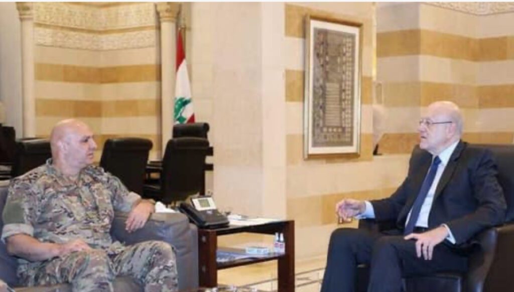 يجتمع رئيس الحكومة نجيب ميقاتي مع قائد الجيش العماد جوزاف عون في السراي الحكومي.