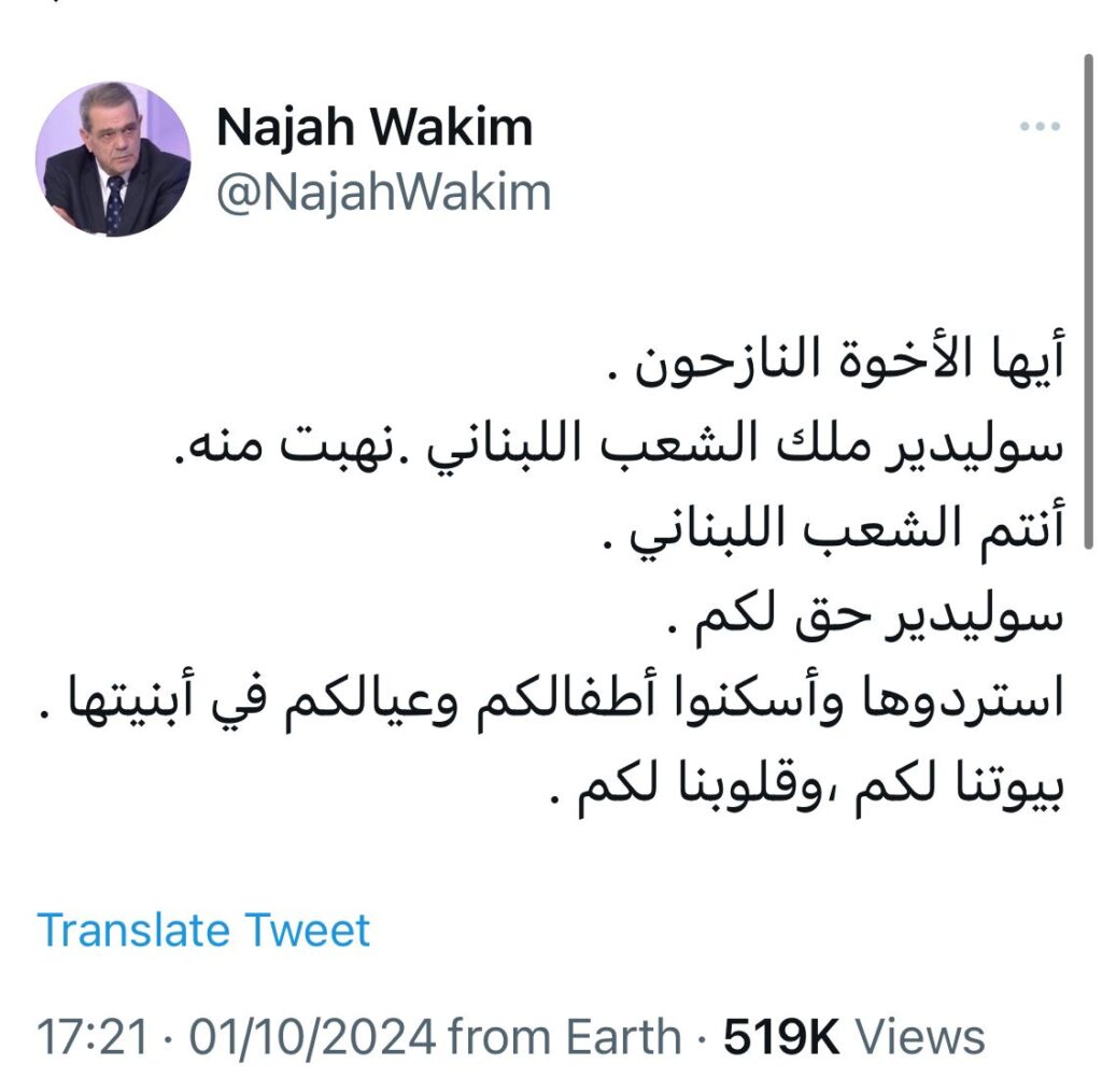 تقدم المحاميان محمد محمود يموت وسامر فاروق غلاييني، أمس، بإخبار أمام النيابة العامة التمييزية، بوجه النائب السابق نجاح واكيم، جرى تحويله اليوم إلى المباحث الجنائية، بجرم المس بالأمن والاستقرار الوطني والتحريض على التعدي على الأملاك الخاصة وإثارة الفتن ليأخذ مجراه القانوني.يأتي الاخبار على خلفية التعليق الذي نشره واكيم يوم الثلاثاء في 2 تشرين الأول الماضي، على حسابه الشخصي عبر منصة “أكس”، وجاء فيه: “أيها الاخوة النازحون . سوليدير ملك الشعب اللبناني ..نهبت منه. أنتم الشعب اللبناني . سوليدير حق لكم. استردوها وأسكنوا أطفالكم وعيالكم في أبنيتها . بيوتنا لكم، وقلوبنا لكم “.