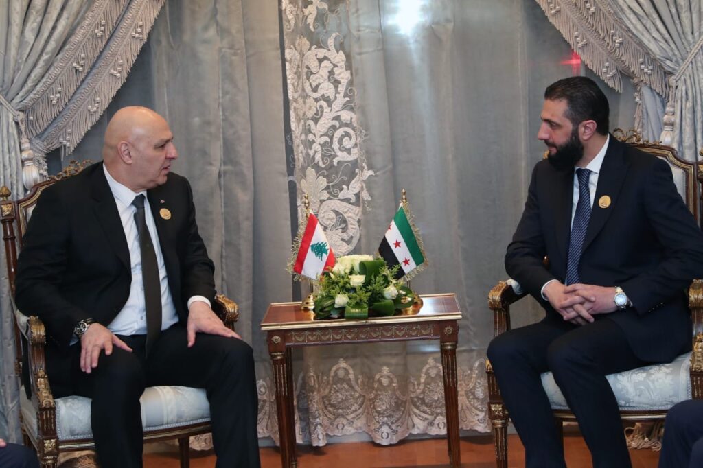 كما التقى الرئيس عون الرئيس السوري احمد الشرع، في حضور اعضاء وفدي البلدين، حيث تم عرض العلاقات بين البلدين ومستقبلها. وتطرق البحث الى عدد من المسائل العالقة، وتم الاتفاق على التنسيق من خلال اللجان المشتركة بعد تشكيل الحكومة السورية الجديدة، وعلى ضرورة ضبط الحدود اللبنانية – السورية لمنع التجاوزات على أنواعها.
