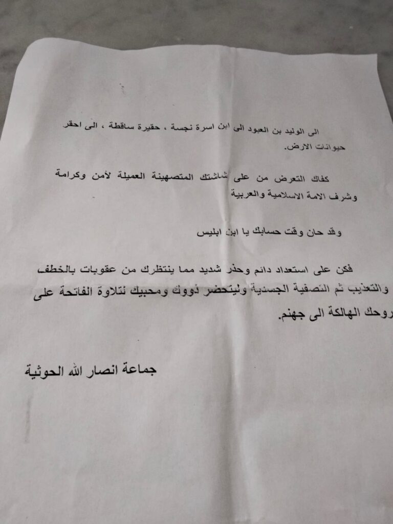 تعرّض الإعلامي اللبناني وليد عبود صباح اليوم الاثنين لتهديدات مباشرة أمام منزله، عبر منشورات ورقية وُزعت في محيط المكان، موقّعة باسم “جماعة أنصار الله الحوثية”، تضمنت عبارات شديدة اللهجة وتهديدات صريحة بالخطف والتعذيب والقتل.