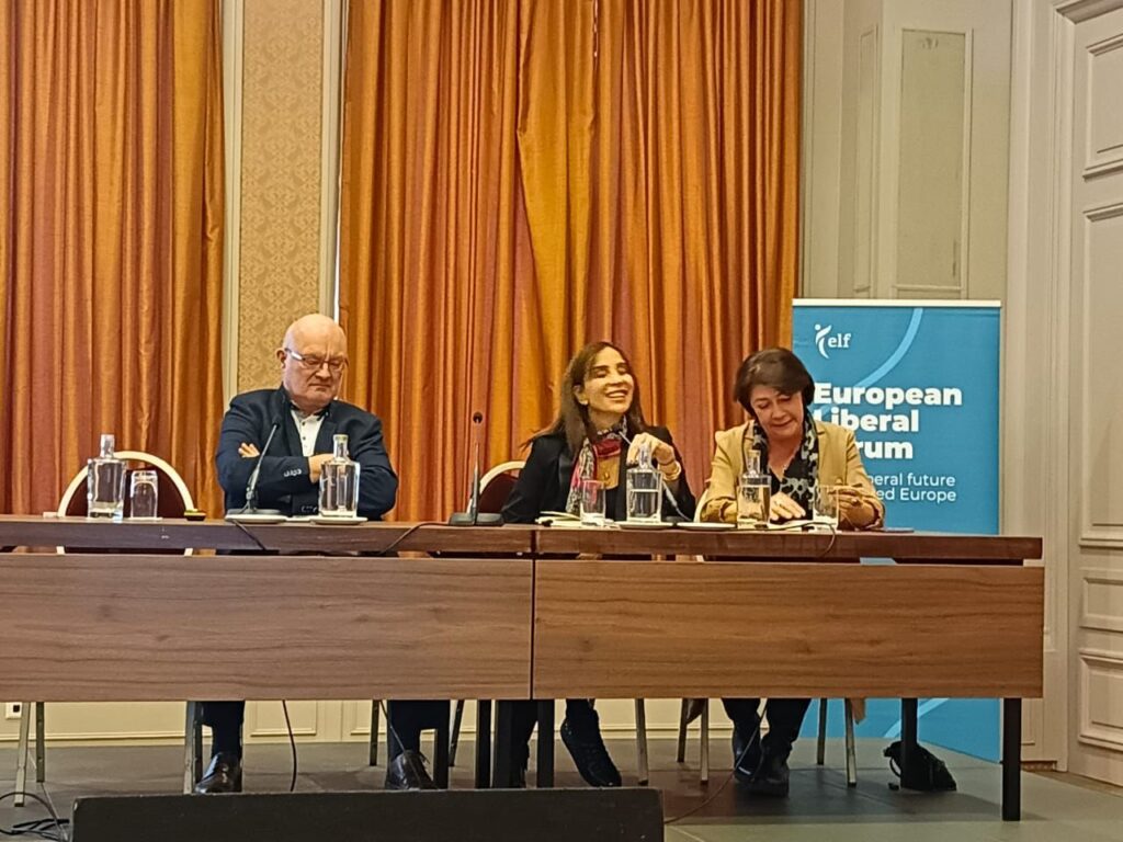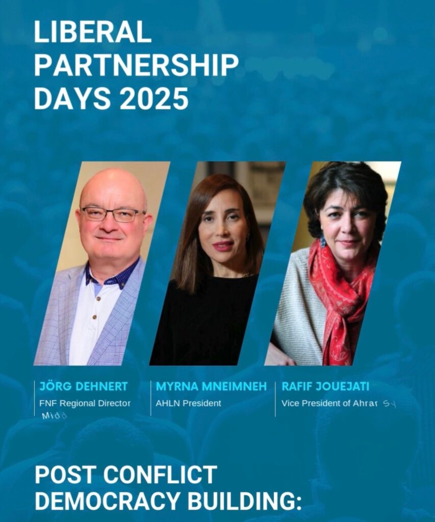 وشارك فيها إلى جانبها كل من مدير مكتب مؤسسة فريدريش ناومن للحرية في الشرق الأوسط وشمال أفريقيا يورغ دنهارت، ونائبة رئيس الحزب الليبرالي السوري رفيف جويجاتي