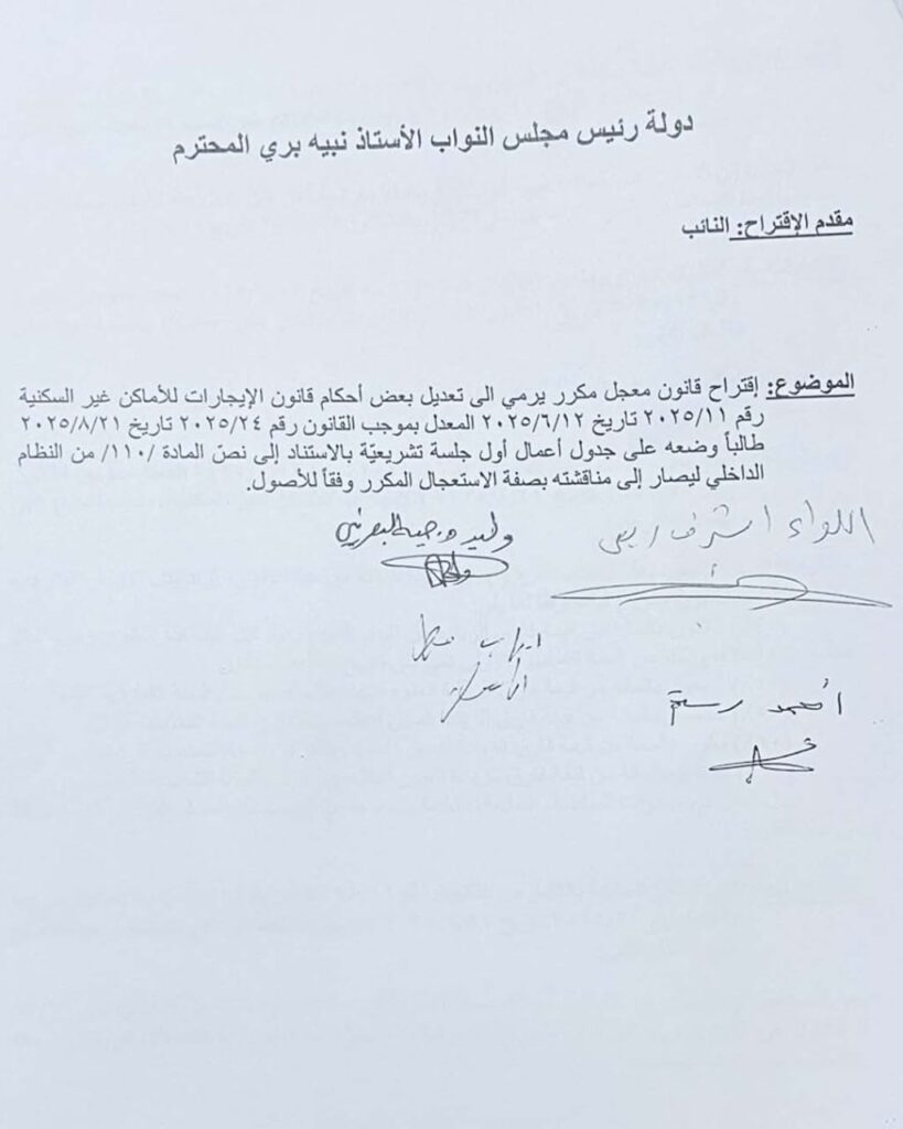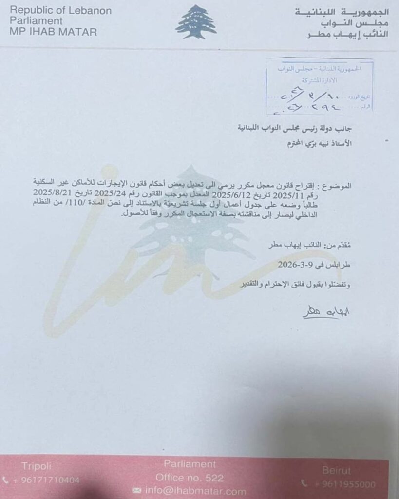 تقدّم النائب ايهاب مطر والنواب: أشرف ريفي، وليد البعريني، وأحمد رستم، باقتراح قانون معجل مكرر يهدف إلى تعديل بعض أحكام قانون الإيجارات للأماكن غير السكنية، طالبين إدراجه على جدول أعمال أول جلسة تشريعية، استنادًا إلى نص المادة /110/ من النظام الداخلي، ليصار إلى مناقشته بصفة الاستعجال المكرر وفقًا للأصول.