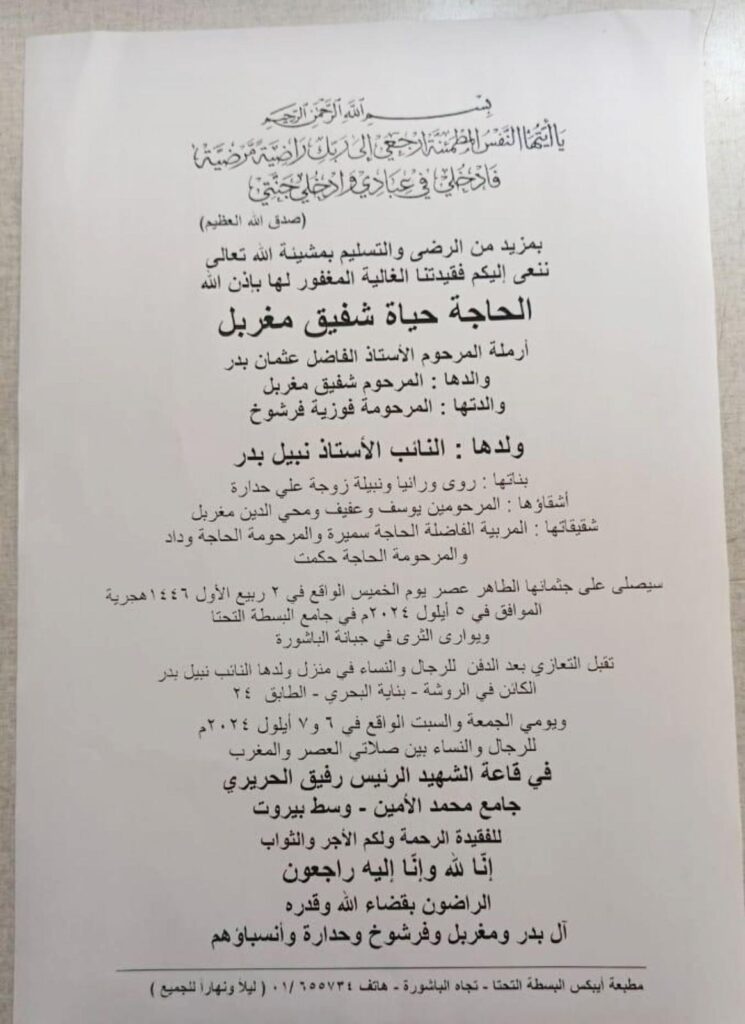 توفيت والدة النائب نبيل بدر الحاجة حياة شفيق مغربل